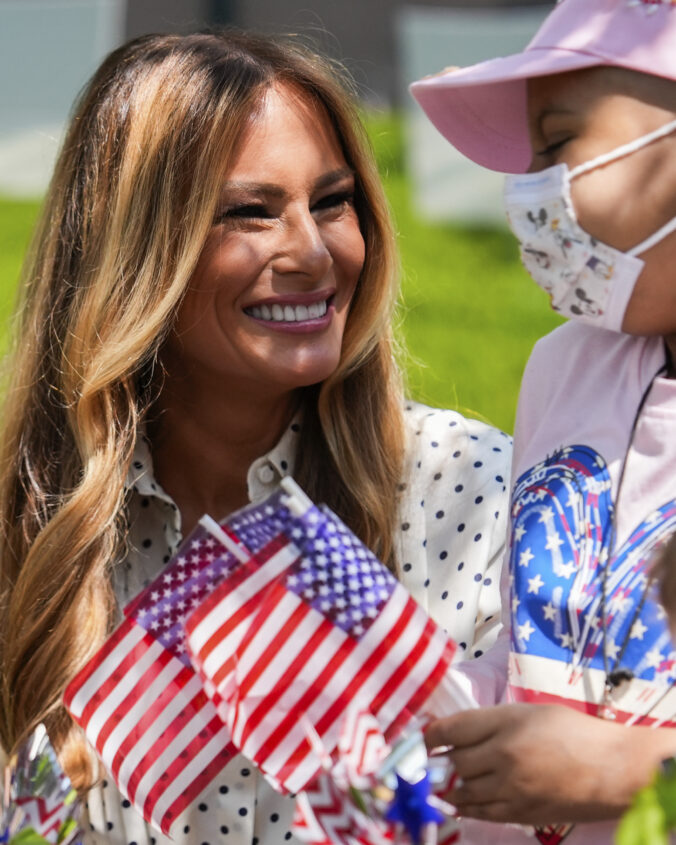 Prvá dáma Melania Trump drží americkú vlajku počas návštevy Detskej národnej nemocnice. Washington, 3. júl, 2025. Foto: AP Photo/Julia Demaree Nikhinson