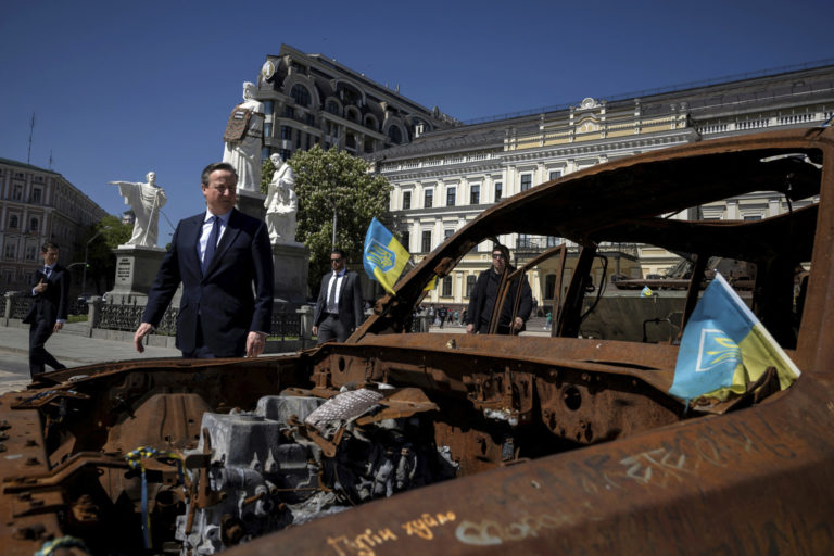Britský minister zahraničných vecí David Cameron prechádza okolo výstavy zničených ruských vojenských vozidiel na Námestí svätého Michala v Kyjeve vo štvrtok 2. mája 2024. Foto: Thomas Peter/Pool Photo via AP