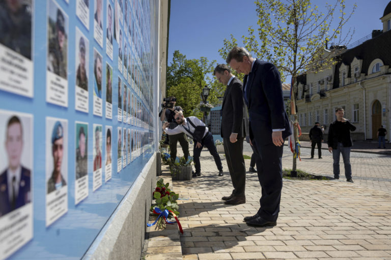 Britský minister zahraničných vecí David Cameron (vpravo) a ukrajinský minister zahraničných vecí Dmytro Kuleba vzdávajú úctu pri pamätnej stene padlým vojakom pred Kláštorom svätého Michala so zlatou kupolou v Kyjeve na Ukrajine vo štvrtok 2. mája 2024. Foto: Thomas Peter/Pool via AP