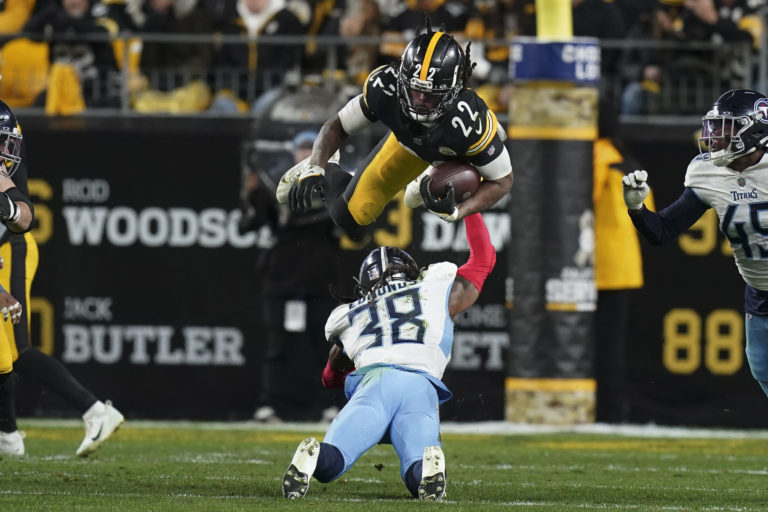 Hráč Pittsburgh Steelers Najee Harris preskočil ponad Terrella Edmundsa Tennessee Titans počas druhého polčasu futbalového zápasu NFL v Pittsburghu. Foto: SITA/AP.