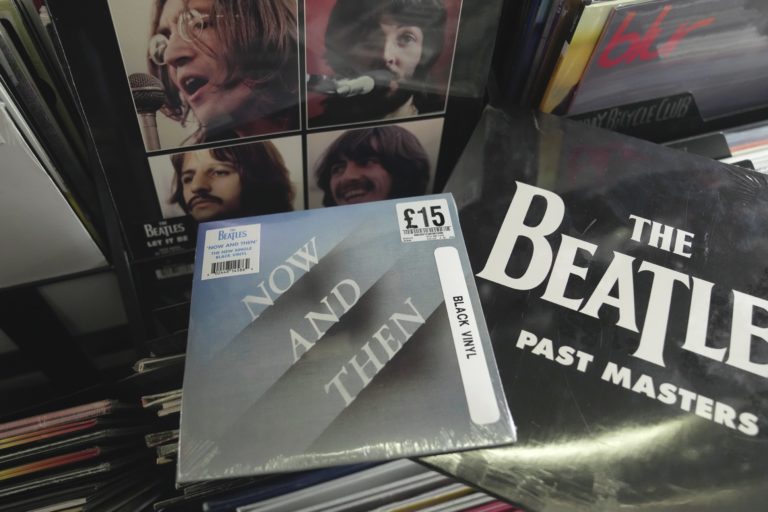 V londýnskej predajni s platňami je na predaj nový singel The Beatles s názvom „Now and Then“, ktorý je zároveň aj úplne posledným. Vznikol v roku 1962, kedy John Lennon nahral hrubé demo. Skladbu sa podarilo dokončiť dokončili Paulovi McCartneymu a Ringovi Starrovi. Foto: SITA/AP.
