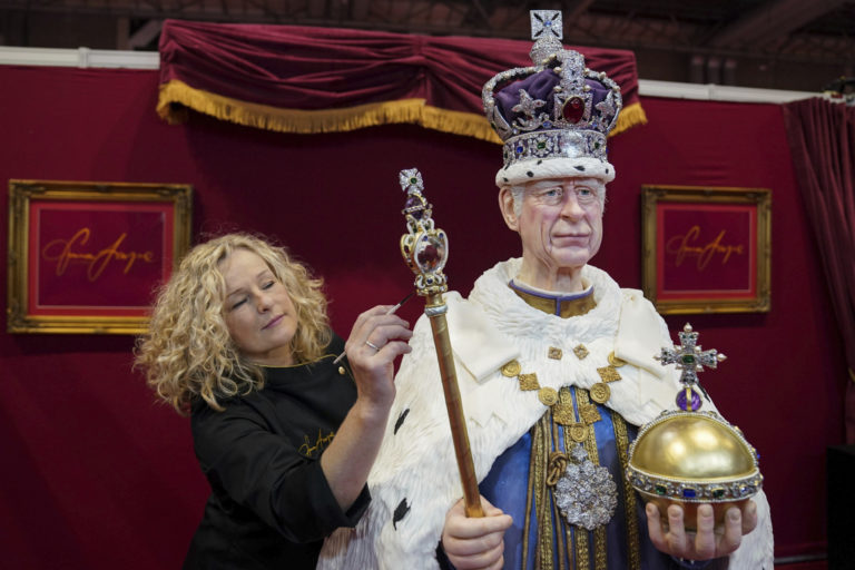 Cukrárka Emmy Jayne robí finálne úpravy na torte britského kráľa Karola III. v životnej veľkosti. Foto: Jacob King/PA via AP.