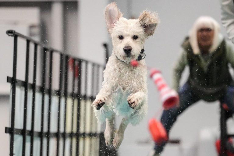 Pes súťaží v skoku do diaľky na výstave psov v nemeckom Dortmunde. Foto: SITA/AP.