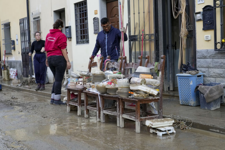 Ľudia čistia svoje domovy a obchody od bahna, ktoré tu zostalo po záplavách v Toskánsku. Foto: SITA/AP.