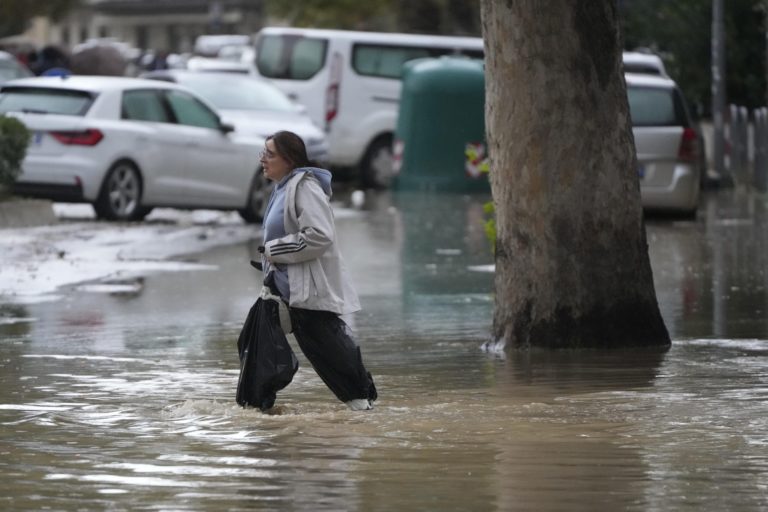 Žena ide po zaplavenej ulici v Campi di Bisenzio v Toskánsku. Foto: SITA/AP.