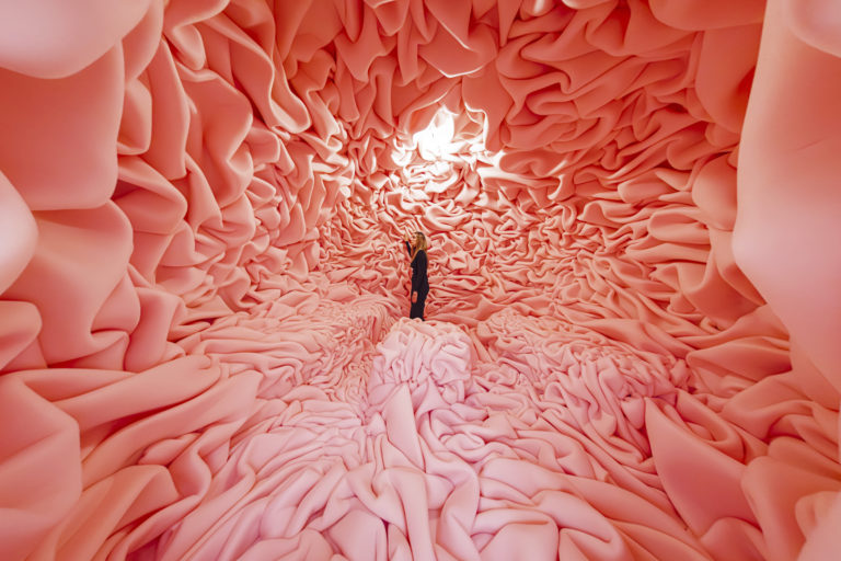 Žena pózuje v inštalácii „Hole in home“ (1966) nemeckého umelca Ferdinanda Spindela vo švajčiarskom Lausanne. Foto: Valentin Flauraud/Keystone via AP.