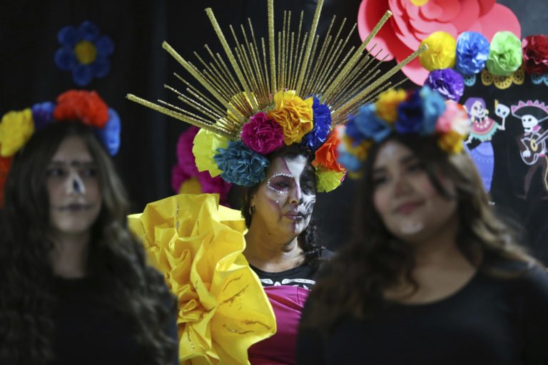 Rafaela Delgado má na sebe svoj farebný Catrina outfit počas súťaže, ktorú každý rok hodnotia univerzitní profesori mexicko-amerických štúdií v Alame v Texase. Foto: Delcia Lopez/The Monitor via AP.