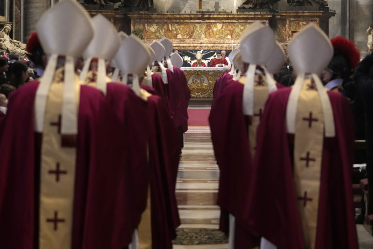 Pápež František slúži omšu za dušu zosnulého Benedikta XVI. a zosnulých biskupov v Bazilike sv. Petra vo Vatikáne. Foto: SITA/AP.
