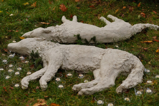 Dve umelecké plastiky vlkov od Alexandry Hoferovej - pár, samca a samice, ktorí boli odstrelení ako prví v tomto roku. Organizácie WWF Slovensko, My sme les, Aevis a Zelená väčšina symbolicky zapálili 46 sviečok, jednu za každého doposiaľ zastreleného vlka v deň svätého Huberta, patróna poľovníkov. Príbeh svätého Huberta slúži ako symbol zodpovedného lovu a úcty k prírode. Bratislava, 3. november 2025. Foto: SITA/Iniciatíva My sme les