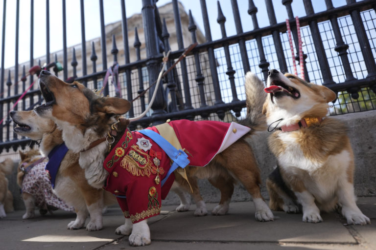 Sprievod psov pred Buckinghamským palácom v Londýne na pamiatku zosnulej kráľovnej Alžbety II. Foto: SITA/AP.