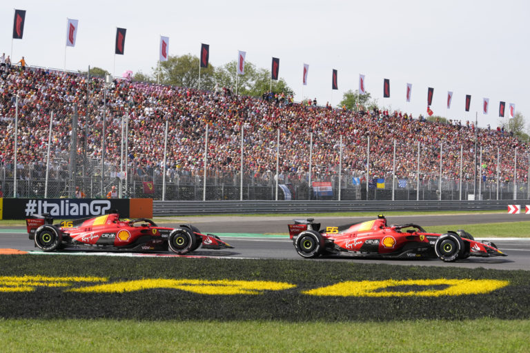 Jazdci Ferrari Charles Leclerc a Carlos Sainz počas Veľkej ceny Talianska na okruhu v Monze. Foto: SITA/AP.