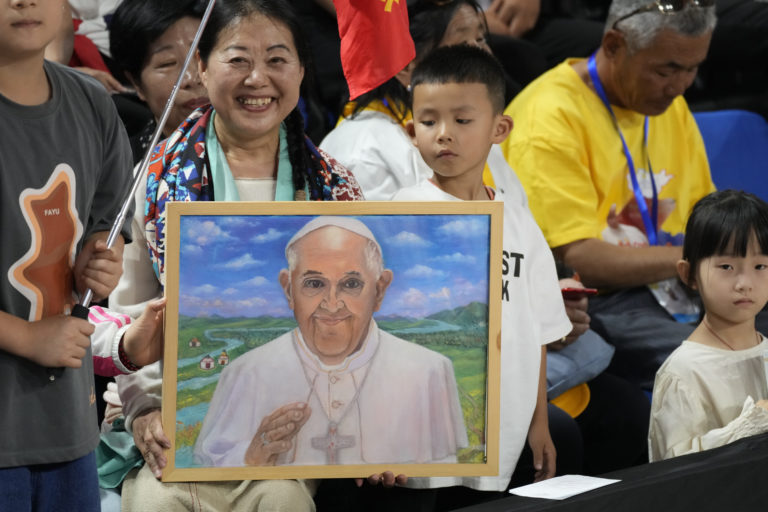 Veriaci v Ulánbátare s portrétom pápeža Františka, ktorý celebroval omšu v rámci jeho návštevy Mongolska. Foto: SITA/AP.