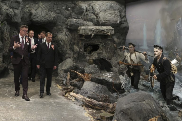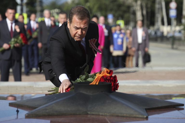 Ruský exprezident Dmitrij Medvedev počas osláv venovaných Dňu víťazstva nad Japonskom a koncu druhej svetovej vojny v Sachalinsku. Foto: Jekaterina Štukina/Sputnik Pool Photo via AP.