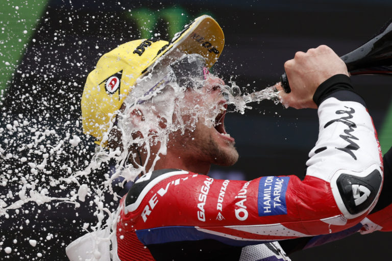 Brit Jake Dixon na pódiu po jeho triumfe v triede Moto2 na Veľkej cene Katalánska. Foto: SITA/AP.