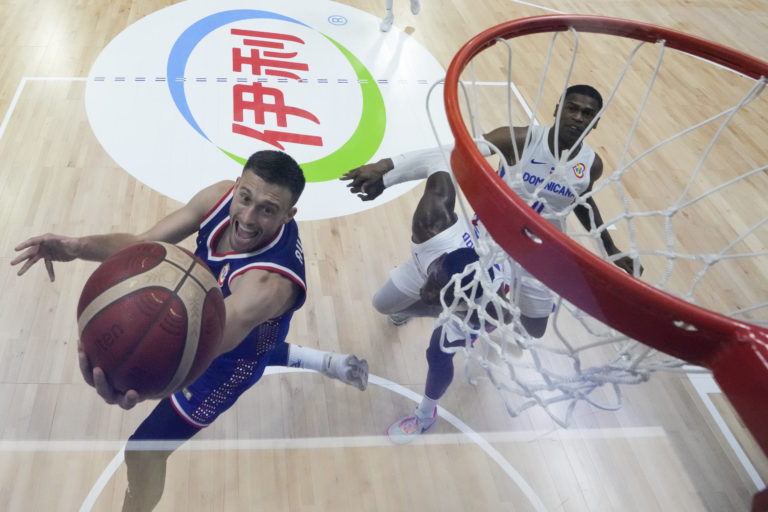 Srbský reprezentant Aleksa Avramovič (30) počas zápasu proti Dominikánskej Republike na MS v basketbale mužov 2023. Foto: SITA/AP.