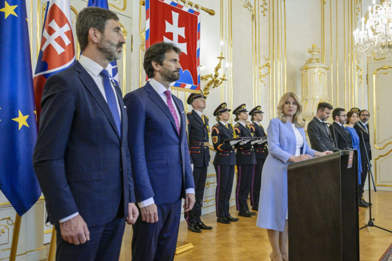 Zľava v popredí: Minister zahraničných vecí a európskych záležitostí SR Juraj Blanár, minister vnútra SR Róbert Kaliňák a prezidentka Zuzana Čaputová počas odovzdávania ďakovných medailí v Prezidentskom paláci pri príležitosti 20. výročia vstupu Slovenskej republiky do Európskej únie (EÚ) a Organizácia Severoatlantickej zmluvy NATO 28 osobnostiam, ktoré sa v období pred rokom 2004 priamo podieľali na prístupovom procese, alebo iným spôsobom podporovali integračné úsilie SR. Bratislava, 30. apríl 2024. Foto: SITA/Milan Illík