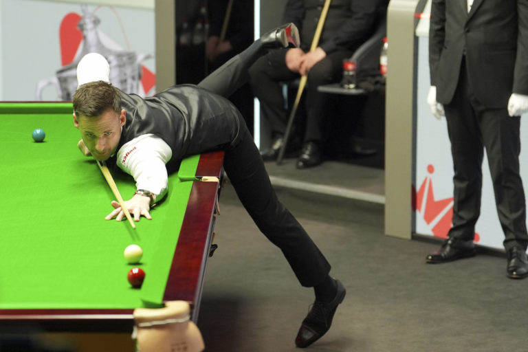 Aj takto sa hrá snooker. David Gilbert v akcii počas svetového šampionátu v snookeri. Sheffield, 30. apríl 2024. Foto: Martin Rickett/PA via AP