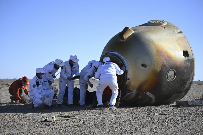 Pracovníci otvárajú kapsulu čínskej kozmickej lode Shenzhou-17 po úspešnom pristátí na Zemi. Foto: Lian Zhen/Xinhua via AP