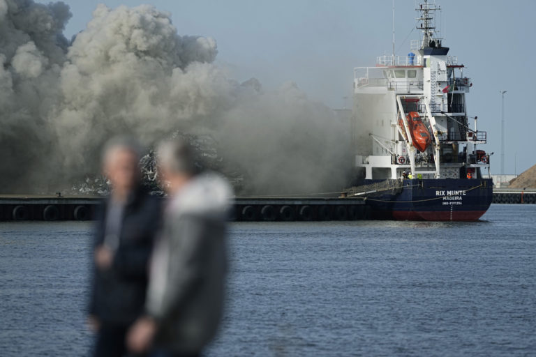 Požiar na lodi kotviacej v Dánsku. Koege, 30. apríl 2024. Foto: Ritzau Scanpix via AP