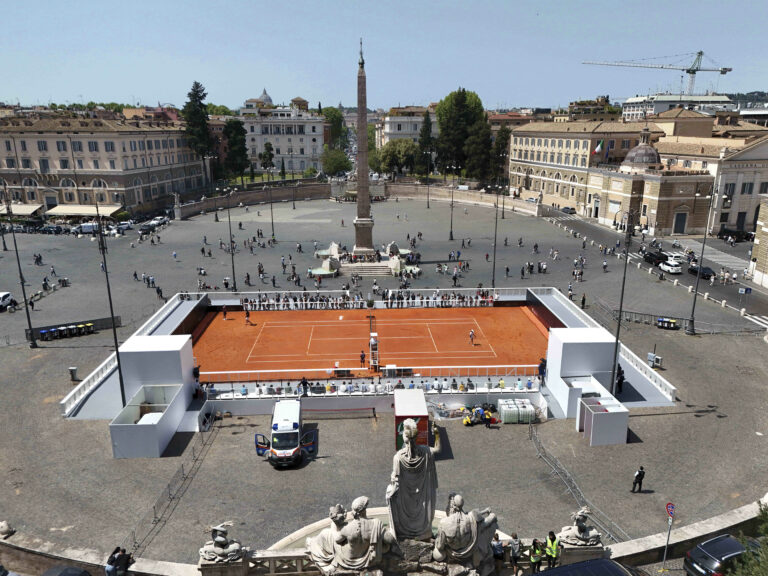 Pohľad na tenisový kurt zriadený na námestí Piazza del Popolo. Rím, 30. apríl 2024. Foto: Alfredo Falcone/LaPresse via AP