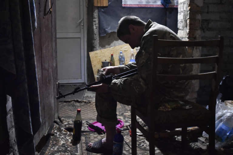 Ukrajinský vojak v úkryte čistí svoju zbraň. Orichiv, 30. apríl 2024. Foto: SITA/AP