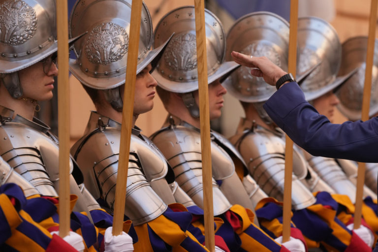 Regrúti vatikánskej Švajčiarskej gardy počas príprav na slávnostnú prísahu. Vatikán, 30. apríl 2024. Foto: SITA/AP