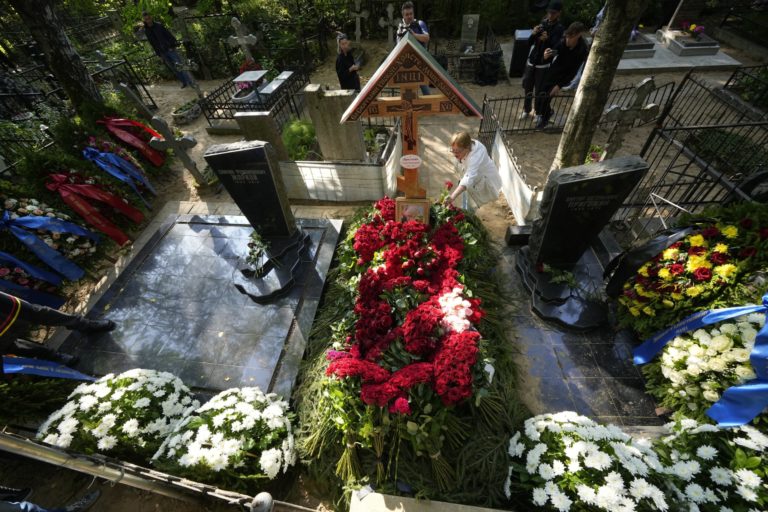 Hrob šéfa Wagnerovej skupiny Jevgenija Prigožina je obložený kvetmi na cintoríne Porochovskoje v Petrohrade. Prigožin zomrel minulý týždeň pri páde lietadla. Foto: SITA/AP