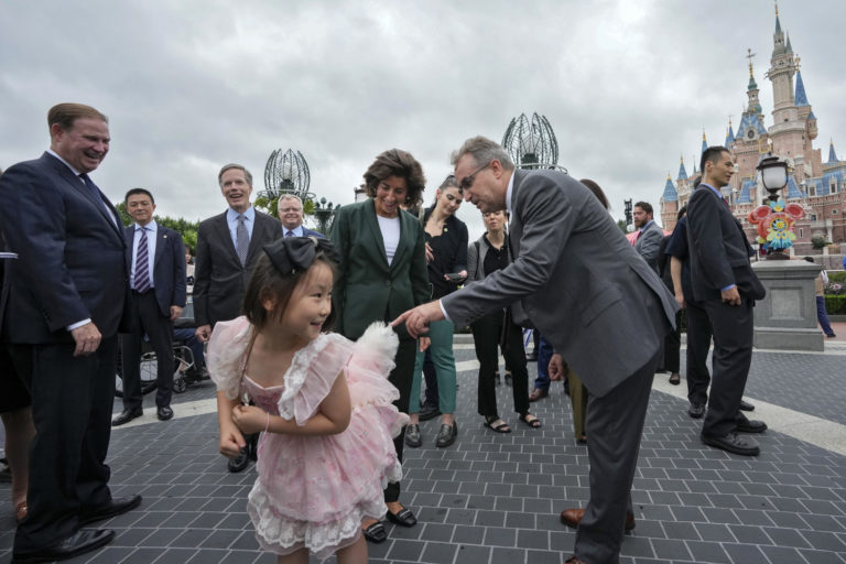 Dievčatko oblečené v šatách s postavičkou LinaBell ukazuje chvost americkej ministerke obchodu Gine Raimondovej počas návštevy Disneylandu v Šanghaji. Foto: SITA/AP Photo/Andy Wong, Pool