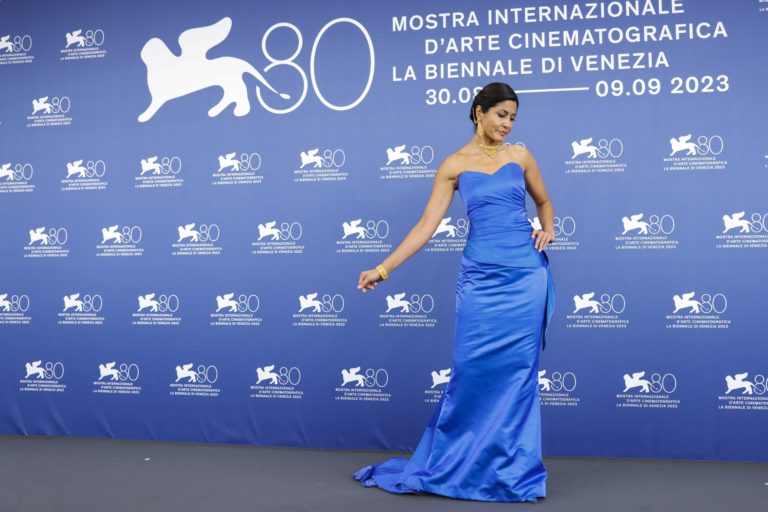 Angeliqa Devi pózuje fotografom počas počas 80. ročníka Benátskeho filmového festivalu. Foto: SITA/Photo by Vianney Le Caer/Invision/AP