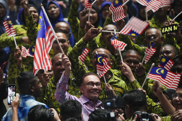 Malajzijský premiér Anwar Ibrahim máva štátnou vlajkou po tom, čo v kongresovom centre v meste Putrajaya predniesol prejav k Národnému dňu. Foto: SITA/AP