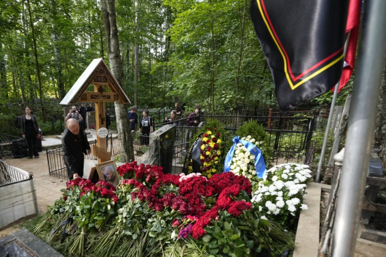 Hrob šéfa Wagnerovej skupiny Jevgenija Prigožina na cintoríne Porochovskoje v Petrohrade. Prigožin zomrel minulý týždeň pri páde lietadla. Foto: SITA/AP