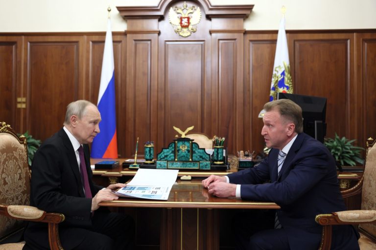 Ruský prezident Vladimir Putin na stretnutí v Kremli s Igorom Šuvalovom, predsedom ruskej štátnej rozvojovej korporácie VEB.RF. Foto: SITA/ Gavriil Grigorov, Sputnik, Kremlin Pool Photo via AP