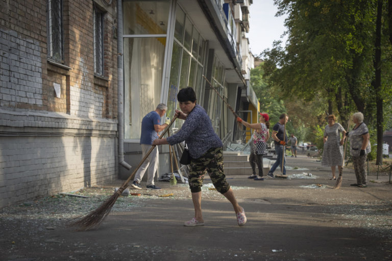 Obyvatelia Kyjeva čistia ulice od rozbitého skla po ruskom raketovom útoku. Systém protivzdušnej obrany v noci zostrelil viac ako 20 rakiet a dronov. Foto: SITA/AP