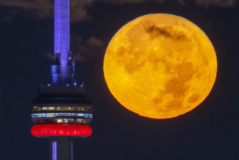 Superspln, známy ako "modrý Mesiac" za vežou CN v Toronte. Foto: Frank Gunn /The Canadian Press via AP