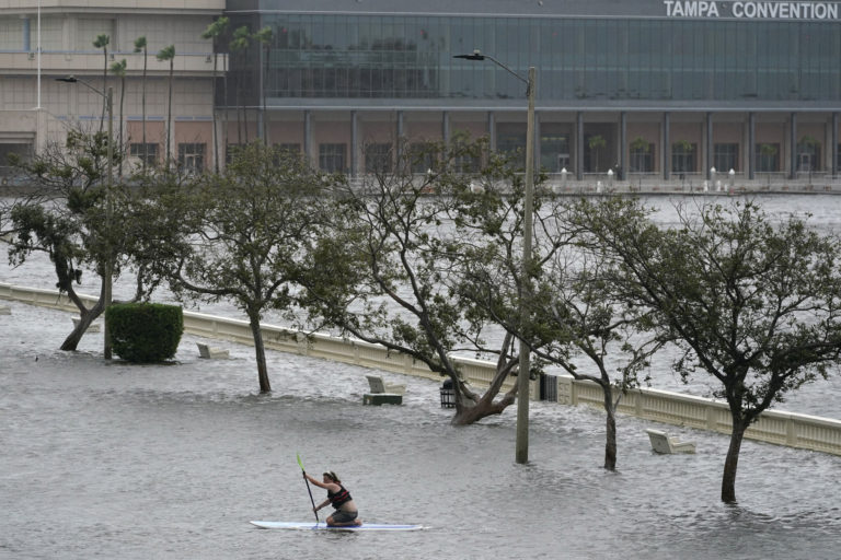 Muž sa plaví na paddleboarde v strede zaplaveného Bayshore Boulevard v centre Tampy. Hurikán Idalia v stredu dosiahol pevninu Floridy a spôsobil záplavy. Foto: SITA/AP