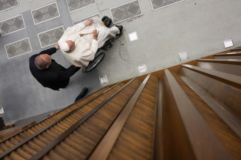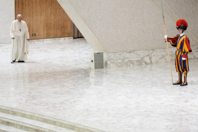 Pápež František prichádza na týždennú generálnu audienciu, ktorá sa koná v sále pápeža Pavla VI. vo Vatikáne. Foto: SITA/AP