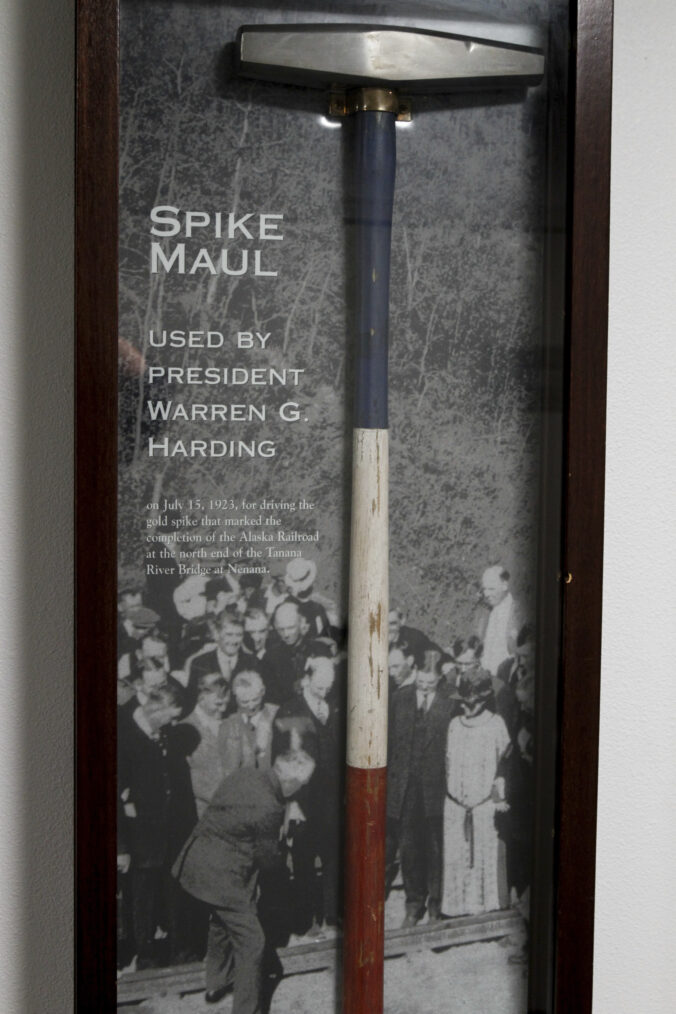 Kladivo s hrotmi, ktoré prezident Warren G. Harding použil na slávnostné zatĺknutie zlatého hrotu pri príležitosti dokončenia Aljašskej železnice 15. júla 1923, je vystavené v ústredí železnice v Anchorage. Aljaška, 8. januára 2025. Foto: AP Photo/Mark Thiessen
