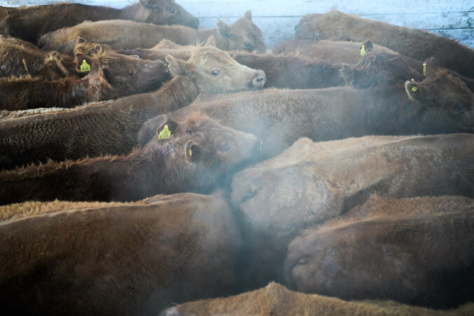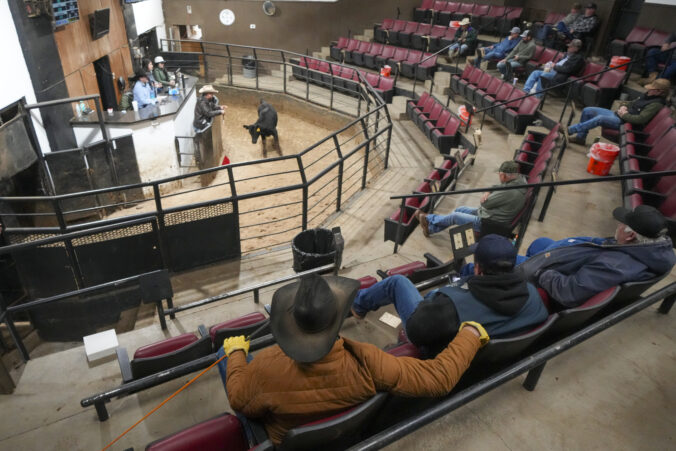 Kupujúci sledujú, ako je krava vystavená v aukčnej aréne v Oklahoma National Stockyards v Oklahoma City. Oklahoma, 14. januára 2025. Foto: AP Photo/Julio Cortez