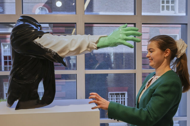 Člen personálu pózuje pri umeleckom diele Willa Booneho s názvom „Frankenstein“ pred aukciou New Now: Modern and Conteporary Art v aukčných sieňach Phillips v Londýne. Anglicko, 4. apríla 2025. Foto: AP Photo/Kirsty Wigglesworth