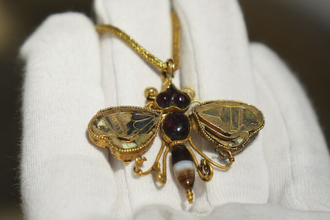Člen personálu aukčného domu Christie's drží grécky zlatý náhrdelník s príveskom v tvare motýľa vykladaným tvrdým kameňom a sklom, datovaný do 2. - 1. storočia pred Kristom, počas tlačovej ukážky v Londýne. Očakáva sa, že náhrdelník sa predá za 25 – 35 000 libier šterlingov (34 – 48 000 USD). Anglicko, 26. júna 2025 Foto: AP Photo/Joanna Chan