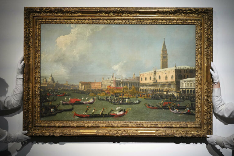 Canalettov obraz „Benátky, návrat Bucintora na Nanebovstúpenie Pána“ vystavený v aukčnej sieni Christie's v Londýne. Obraz, ktorý sa má predať za viac ako 20 miliónov britských libier, povedie večerný výpredaj starých majstrov Christie's v Londýne. Anglicko, 6. júna 2025. Foto: AP Photo/Kirsty Wigglesworth