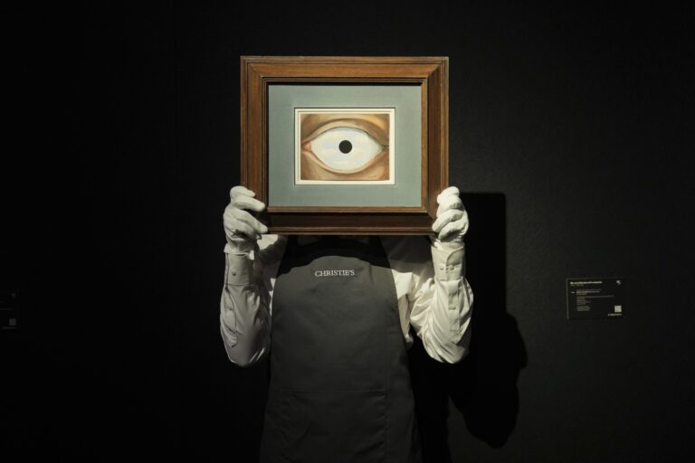 Obraz „Falošné zrkadlo“ od umelca Reného Magritta vystavený na predaj počas mediálnej ukážky večernej aukcie Christie's The Art of the Surreal v Londýne. Anglicko, 27. februára 2025. Foto: AP Photo/Kin Cheung