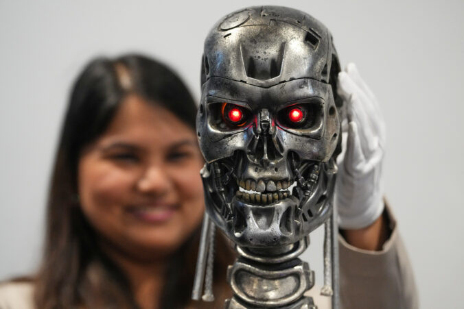 Svietiaca lebka endoskeletu T-800 z filmu Terminátor 2:3D: Bitka v čase (1996), vystavená galérijným asistentom počas tlačovej ukážky živej aukcie Propstore's Winter Entertainment, ktorá sa bude konať od 5. do 7. decembra 2025 v Londýne. Anglicko, 25. novembra 2025. Foto: AP Photo/Kirsty Wigglesworth