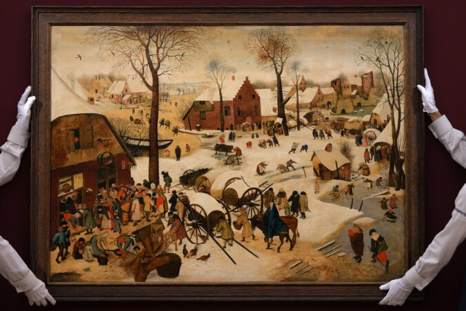 Technici aukčného domu Sotheby's v Londýne upravujú obraz Pietera Brueghela mladšieho s názvom Sčítanie ľudu v Betleheme, ktorý sa odhaduje na tri až päť miliónov britských libier, počas fotokonferencie k aukcii obrazov starých majstrov a obrazov 19. storočia. Anglicko, 28. novembra 2025. Foto: AP Photo/Frank Augstein