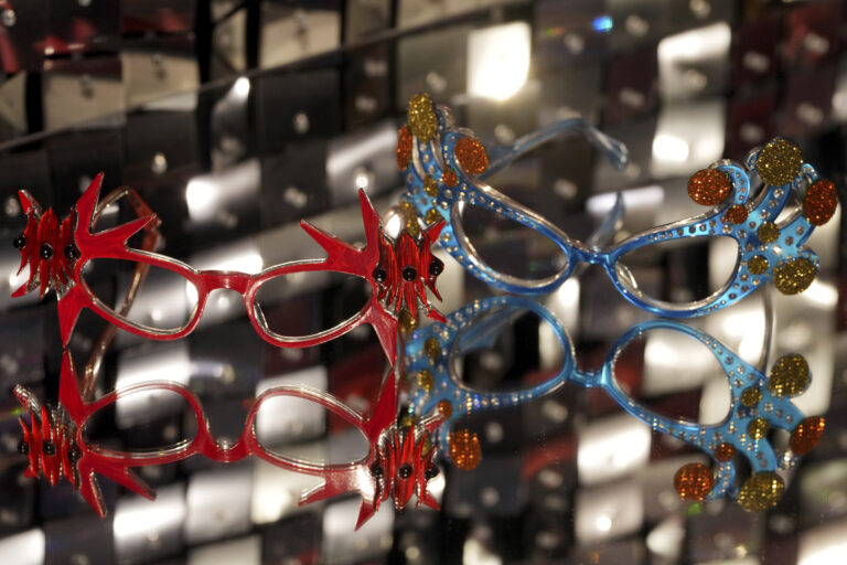 Páry okuliarov vystavené pred predajom diela Barry Humphries: Osobná zbierka, v aukčných sieňach Christie's v Londýne. Anglicko, 7. februára 2025. Foto: AP Photo/Kirsty Wigglesworth