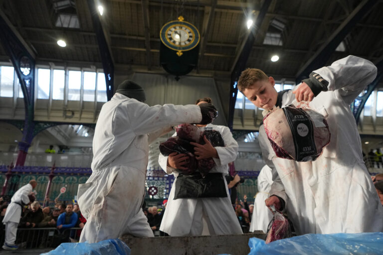 Mäso sa zbiera na predaj počas každoročnej štedrovečernej mäsovej aukcie na Smithfield Market v Londýne. Anglicko, 24. decembra 2025. Foto: AP Photo/Kirsty Wigglesworth