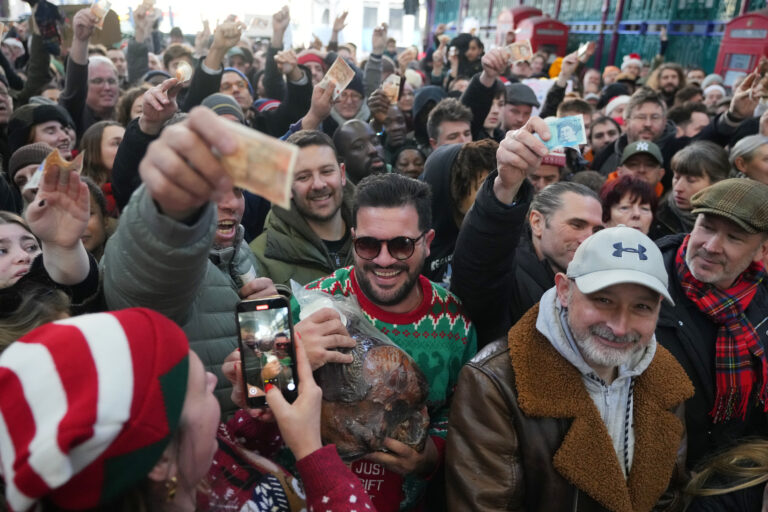 Muž oslavuje po tom, čo si kúpil kus mäsa počas každoročnej štedrovečernej aukcie mäsa na trhu Smithfield v Londýne. Anglicko, 24. decembra 2025. Foto: AP Photo/Kirsty Wigglesworth