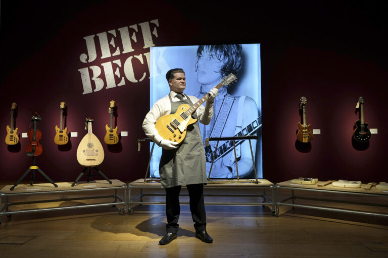 Umelecký poradca vystavuje gitaru Gibson z Kalamazoo v Michigane z roku 1959 a neskôr elektrickú gitaru s pevným telom, Les Paul, známu ako „The Yardburst“ v zbierke gitár Jeffa Becka na predpredajnej výstave v aukčných sieňach Christies v Londýne. Anglicko, 14. januára 2025 Foto: AP Photo/Kirsty Wigglesworth