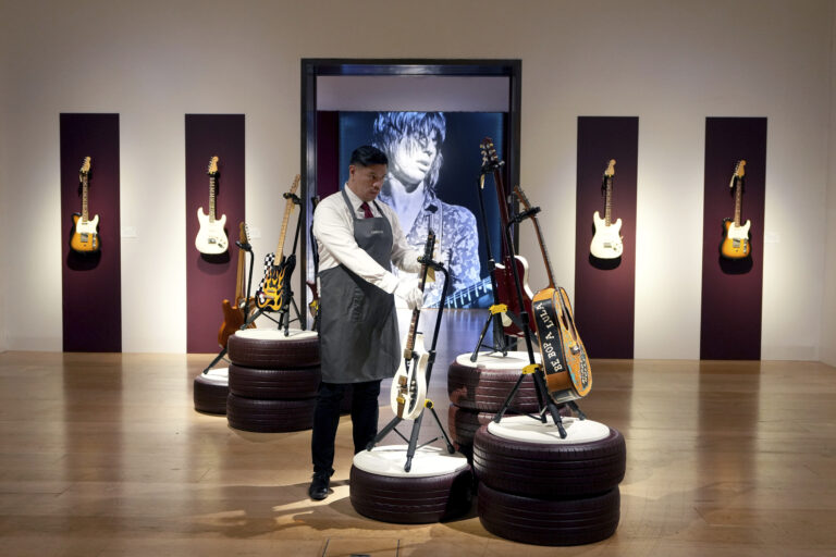 Umelecký aranžér umiestňuje gitary na predpredajnej výstave v aukčných sieňach Christie's v Londýne. Anglicko, 14. januára 2025. Foto: AP Photo/Kirsty Wigglesworth