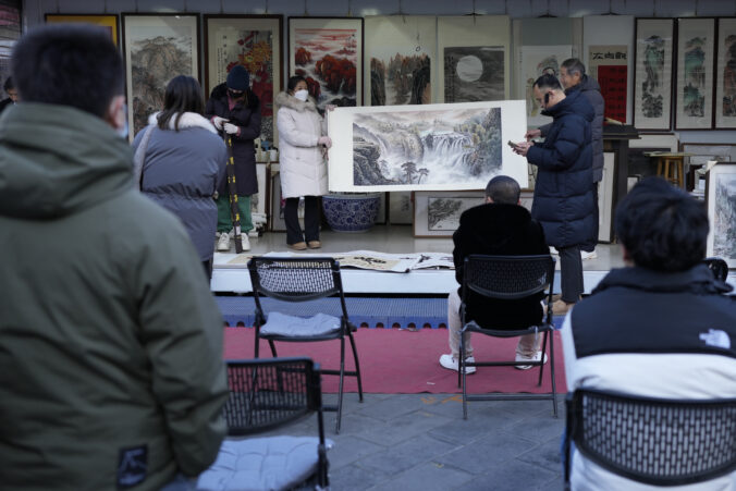 Muži pozorujú verejnú umeleckú aukciu na trhu v Pekingu. Čína, 16. januára 2025. Foto: AP Photo/Aaron Favila